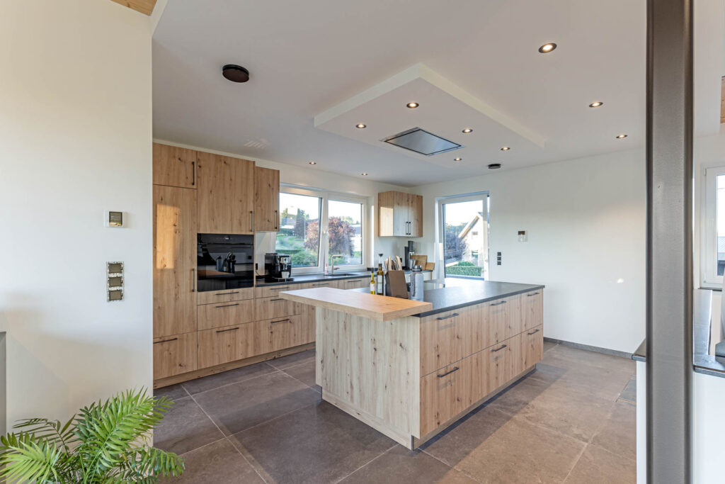 Bei diesem modernen Einfamilienhaus haben wir das komplette Baumanagement übernommen – von der Bodenplatte bis zur schlüsselfertigen Übergabe. Planung, Koordination und Ausführung sämtlicher Gewerke lagen in unserer Hand. Besonderes Augenmerk lag auf der hochwertigen Innenausstattung mit individuell geplanter Küche, Design-Bädern, maßgefertigten Einbaumöbeln und einem offenen Wohnkonzept mit viel Tageslicht. Auch Haustechnik, Lüftung und Heizung wurden vollumfänglich von uns betreut.